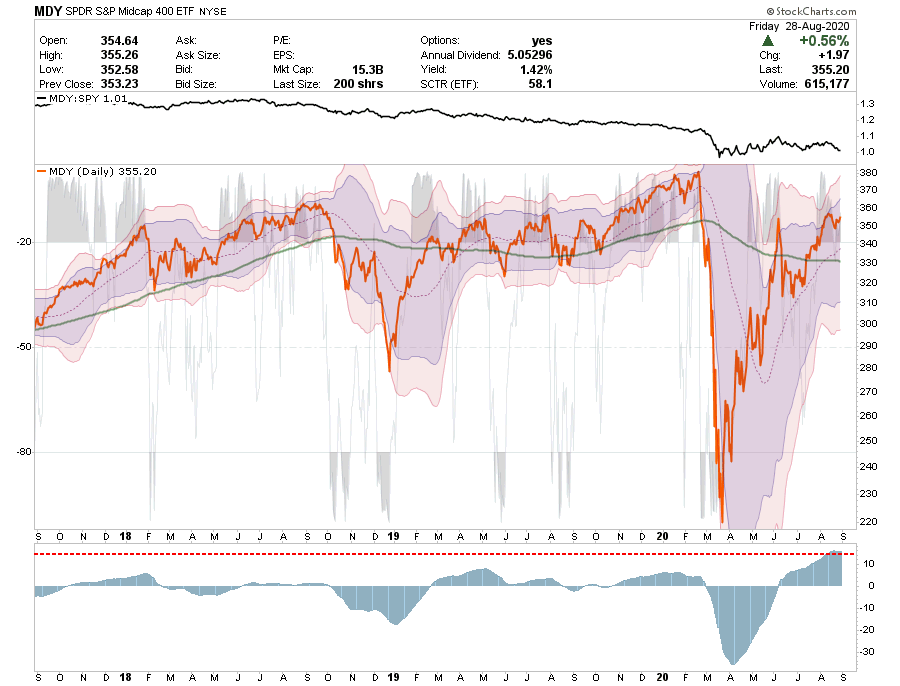 - The relative performance remains poor as with SLY. However, MDY also broke above the 200-dma resistance and failed at the 3-standard deviation level.