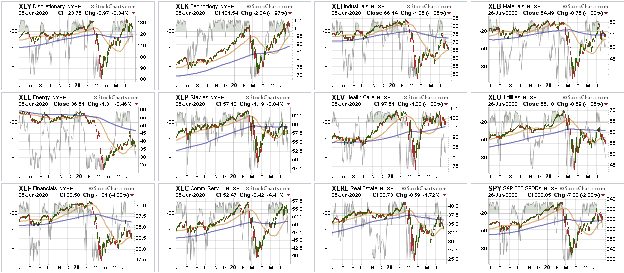 Last week, Financials moved into the improving quadrant of the rotation model, but will likely be short-lived. Recent moves by the Fed to cap buybacks and dividends may add to selling pressure. Materials and Industrial performance overall remains inadequate with a failure at the 200-dma. Energy is deeply oversold and is cheap on a value basis; we may look to add to our exposure again.