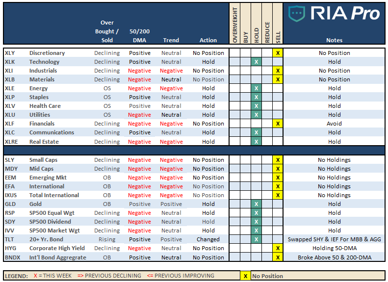 As we have been increasing our “equity” exposure in portfolios, we have added more to our holding in TLT to improve our “risk” hedge. However, with yields so low, and with the Fed supporting the mortgage-back and corporate bond markets, we swapped our near zero-yielding short-term Treasury funds for Mortgage-Backed and Broad Market bond funds with 2.5% yields. No change this week.