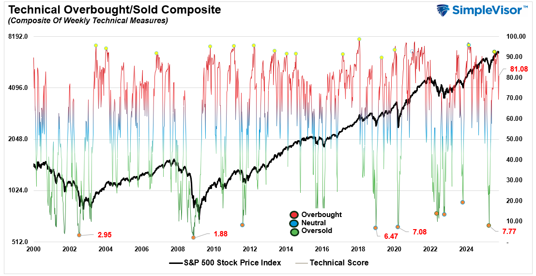 Despite the recent pickup in market volatility this week, the rally from the April lows has been breathtaking. As such, the current correction certainly has further to go. Maybe that is the case; however, while I don’t know with certainty what will happen, it is unsurprising that investors are questioning how much further it can run. The concerns are many and logical. Stocks have pushed too far, too fast. On a longer-term basis, the S&P 500 and Nasdaq are trading near technically overbought levels, and the Relative Strength Index (RSI) on major indexes remains elevated, a threshold that often signals exhaustion in bull trends. Lastly, market breadth remains weak as leadership narrows to a handful of mega-cap tech names, etc. These are all the previous arguments we have presented in the #BullBearReport, and those risks remain.