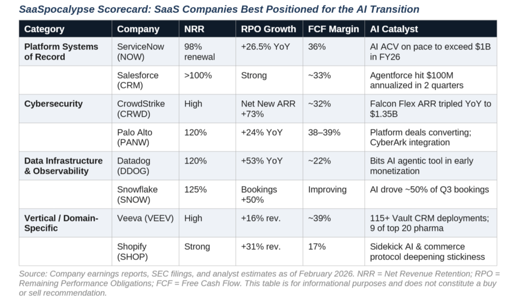 If the SaaSpocalypse narrative proves to be more panic than prophecy, the critical task becomes identifying which companies will emerge stronger. Forrester’s research provides a useful framework: horizontal point-solution vendors with low switching costs and weak enterprise integration face genuine existential risk. But vertical- or domain-specific SaaS vendors, those addressing complex industries like healthcare, manufacturing, or financial services, or those controlling unique proprietary data, have a substantially greater chance of survival and even growth.