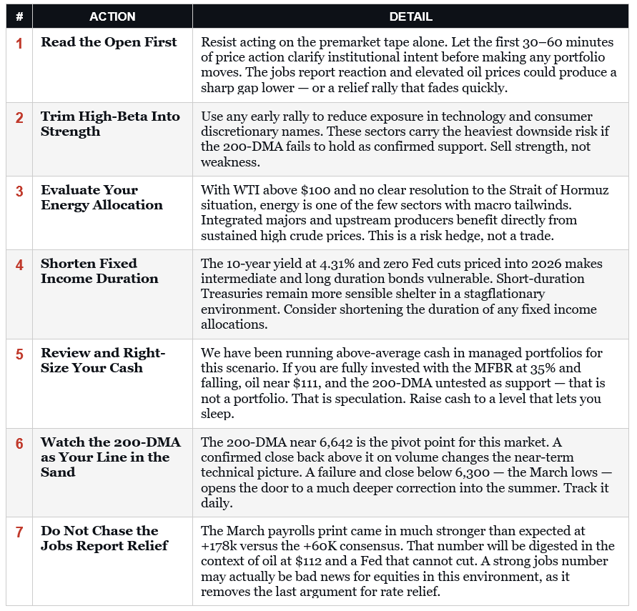 Then came Thursday’s escalation, following President Trump’s prime-time address, which offered no clear path toward ending the conflict or reopening the Strait of Hormuz. Unsurprisingly, oil responded immediately. WTI crude surged to $111.54 per barrel on settlement Thursday, the highest close since June 2022. Equity futures reversed what the bulls had built over two sessions, trading sharply lower Thursday morning before recovering to a small gain by the close. The only thing that likely helped the market end on a good note was that markets were closed for Good Friday. With the jobs report posting a gain of 178,000 on Friday, the market would likely have sold off on the expectation that the Federal Reserve is now fully trapped in terms of monetary policy.