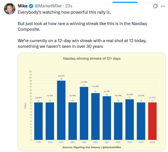 None of this means you should chase here. After a 13% move in three weeks, the market is stretched on every short-term measure. The RSI is pushing overbought above 70, price is extended 7% above the 200-DMA, and the Nasdaq’s 13-day streak has historically preceded 2–5% pullbacks within two weeks. Retail’s return is a yellow flag of sentiment as the “easy money” phase is behind us. On a pullback, the 7,000 level, January’s former all-time high, becomes first support under the classic “old resistance becomes new support” principle. Below that, the 6,870–6,950 zone (February’s consolidation range) should attract strong buying. The 200-DMA (~6,683) remains the line in the sand. A healthy 2–3% pullback to the 7,000–6,950 zone is the spot to add exposure, not up here at fresh highs.