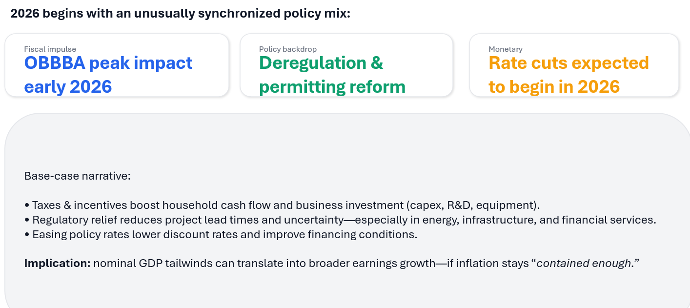 As noted above, the reflation narrative rests on three key arguments: the OBBBA impact, deregulation and reform, and rate cuts.